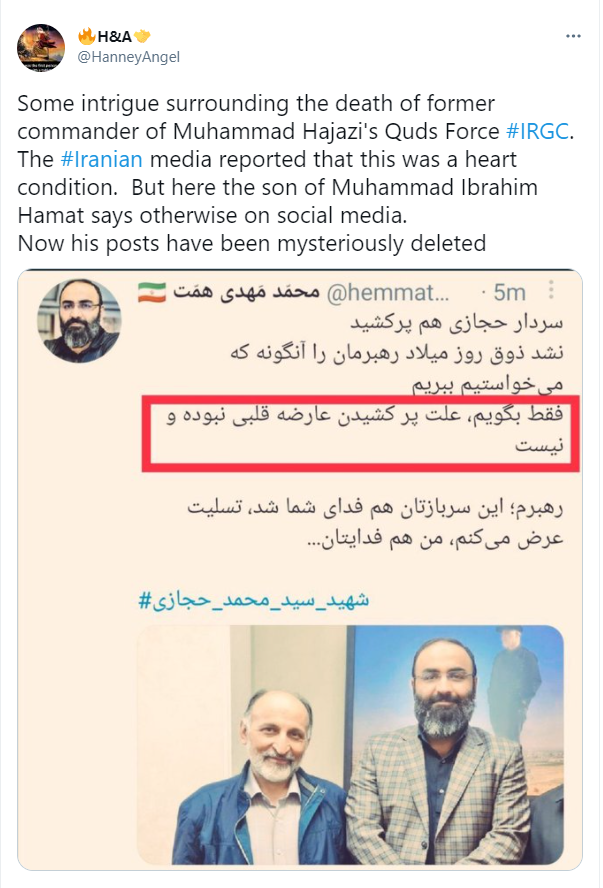 Un éminent Iranien a tweeté que Hejazi n’est pas mort d’une crise cardiaque, mais son poste a été supprimé presque immédiatement.