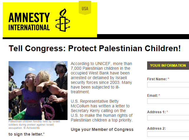 Amnesty aux USA a organisé une pétition, « retweetée » par Amnesty International, demandant que les États-Unis punissent Israël pour avoir arrêté des mineurs palestiniens: