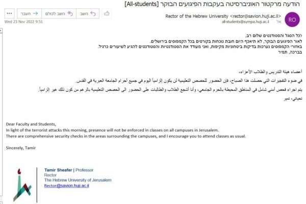 Une déclaration scandaleuse ou une erreur de bonne foi ? Le recteur de l’Université hébraïque de la capitale où deux attentats meurtriers ont eu lieu ce matin (mercredi) a demandé d’envoyer un message aux étudiants indiquant qu’à la lumière des attentats , il n’y aura aucune obligation d’assister aux cours.