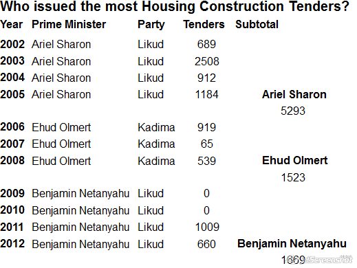 En fait, Bibi dans son mandat actuel a construit moins que tout autre premier ministre, selon cette enquête – un peu plus d’un quart de ce que Barak a construit et environ les deux tiers de ce que Olmert a mis sur terre. Voici les résultats dans le tableau ci- dessous en hébreu.