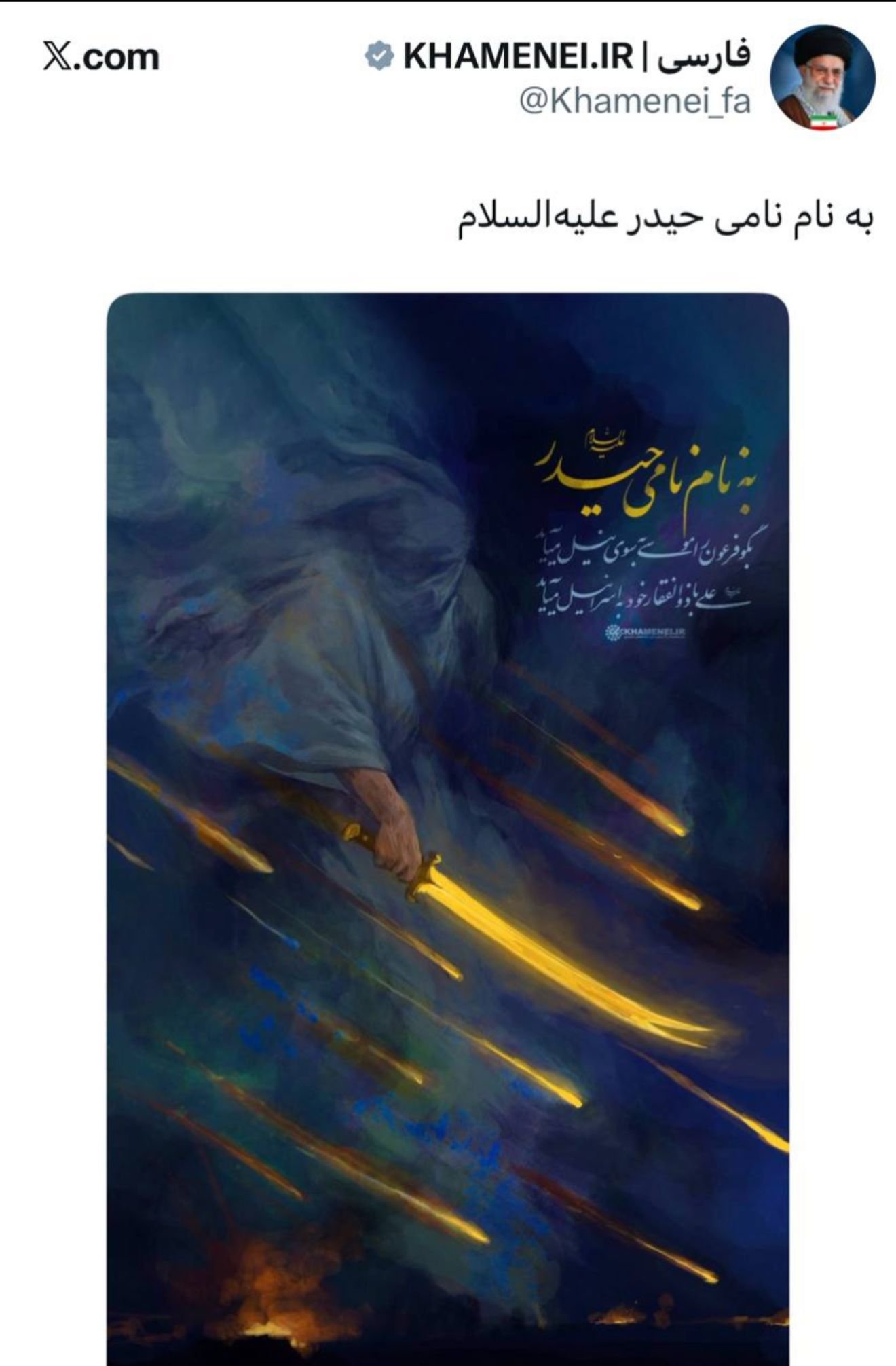 La capture d’écran associée montre un compte X (anciennement Twitter) intitulé « KHAMENEI.IR | فارسی » (@Khamenei_fa). L’image jointe au message représente une figure stylisée tenant une épée lumineuse, dans une ambiance sombre traversée par des traînées de feu. Le visuel renforce la dimension symbolique et idéologique du message, suggérant une vengeance des cieux…