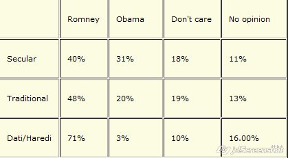 Pour les préférences israéliennes, il y a 3 % pour Obama parmi les Israéliens religieux, à la fois moderne et ultra-orthodoxe. Comme vous pouvez le voir, les groupes les plus religieux sont pour Romney.