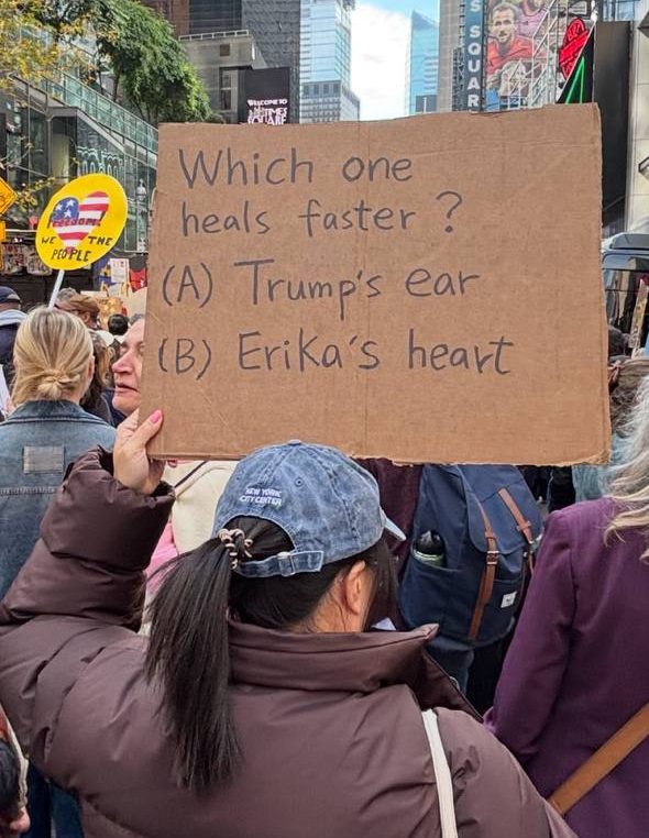 « This is one of the signs that was held by a No Kings protester today. These people are literally glorifying the attempted assassination of President Trump and the assassination of Charlie Kirk. This is the Democrat Party. »