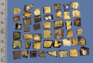 Mosaïque de Gilded  de la période islamique retirée des murs extérieurs du Dôme du Rocher lors de rénovations ultérieures. |