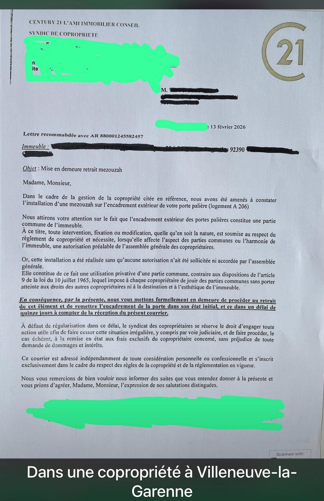 Dans la lettre adressée aux occupants de l’appartement (référencé unité A206), la société de gestion explique avoir constaté « l’installation d’une mezouza sur le montant extérieur de la porte » lors d’un contrôle de gestion.