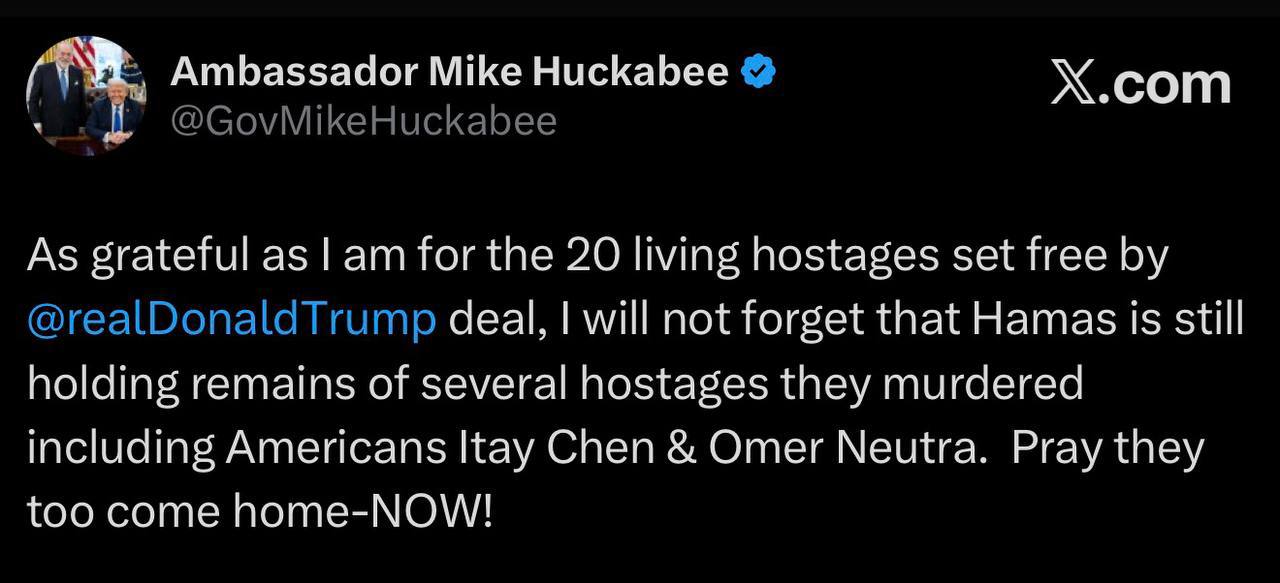 L’ancien gouverneur de l’Arkansas et ex-candidat républicain à la présidentielle Mike Huckabee a publié dans la nuit du 15 au 16 octobre un message poignant sur son compte X (anciennement Twitter). Tout en saluant la libération de vingt otages dans le cadre du plan Trump, il a rappelé que le Hamas détient toujours les dépouilles de plusieurs victimes, dont les Américains Itay Chen et Omer Neutera.