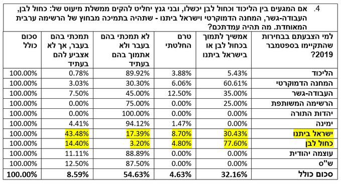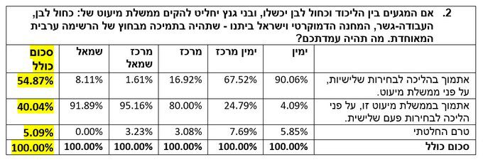Et si les contacts du gouvernement d’union échouent. Plus de 90% de la gauche seraient favorables à un gouvernement minoritaire avec le soutien des Arabes, comparé à une majorité absolue à droite et un centre qui favoriserait de nouvelles élections.