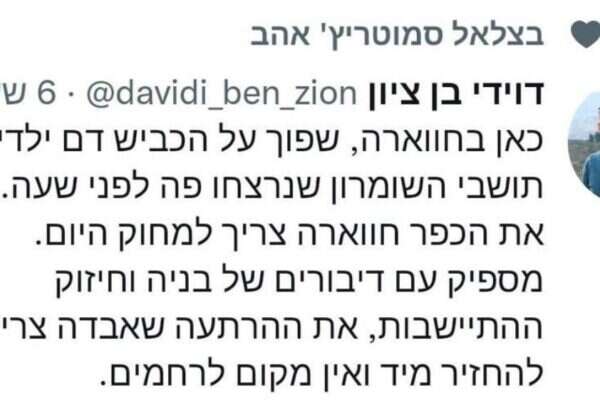 Après le début des émeutes, Ben Zion a tweeté : « Les gars maintenant à Hawara se comportent exactement comme des gars dont les deux frères ont été massacrés de sang-froid aujourd’hui à Hawara à bout portant. . »
