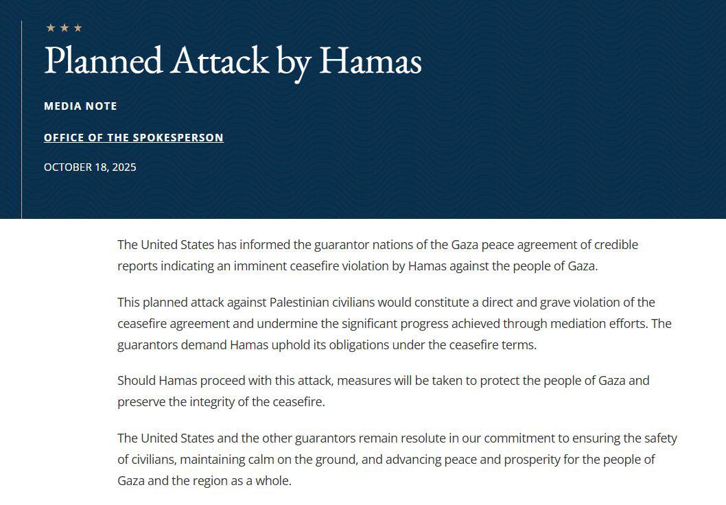 « BREAKING: The United States has warned that Hamas is planning a new attack in Gaza — this time targeting Palestinian civilians. Washington has alerted the guarantor countries of the Gaza peace deal, saying such an attack would break the ceasefire agreement and undo the progress made so far. »